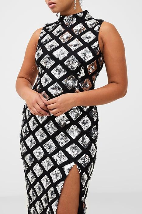 The Discoball Has Nothing On Our Axel Embellished Midi Dress. This Spotlight Stealingmidi Dress Flaunts Diamond Shaped Clusters Of Sparkling Sequin Embellishment To Catchthe Light From Every Angle Whilst A Modish High Neckline And Flirty Leg Split