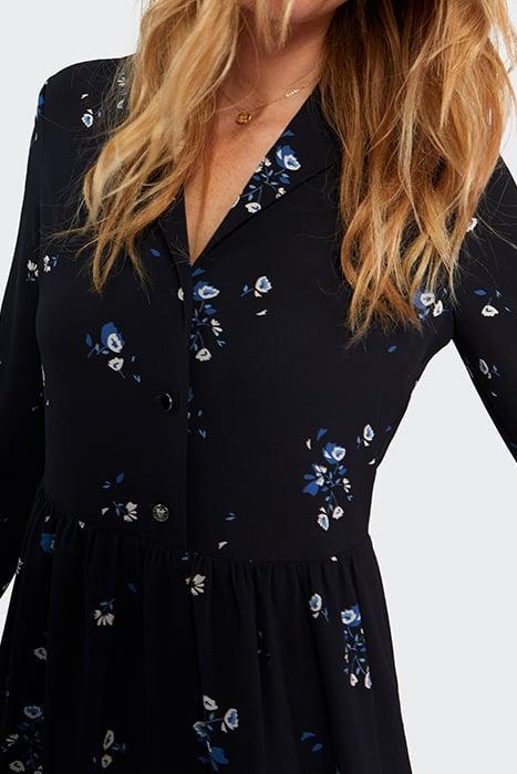 Black A-Line Dress . Suit Collar, Long Sleeves . Exclusive Floral Bouquet Designed By I.Code . Plain Lined Skirt, Waist Seaming . Decorative Buttons Down Front To Fasten . 1 Ic Signature Button, 1 Leopard-Heart Button . Length: 88 Cm .