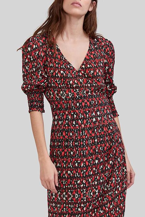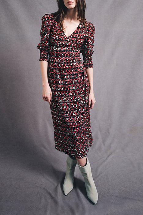 A V Neckline And Pleats On The Shoulders. Midi Length And Side Slits. Rediscover How Powerful A Dress Is. It Has A Very Chic Graphic Ikat Print On Slightly Glittery Viscose.