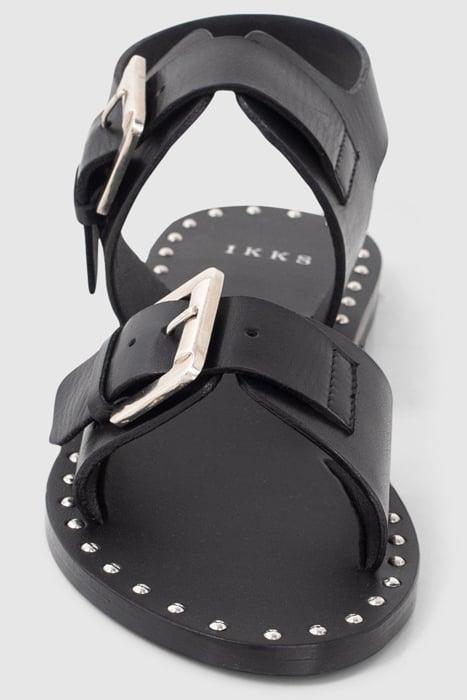 BLACK LEATHER SANDALS, STUDDED WELT, DOUBLE STRAP