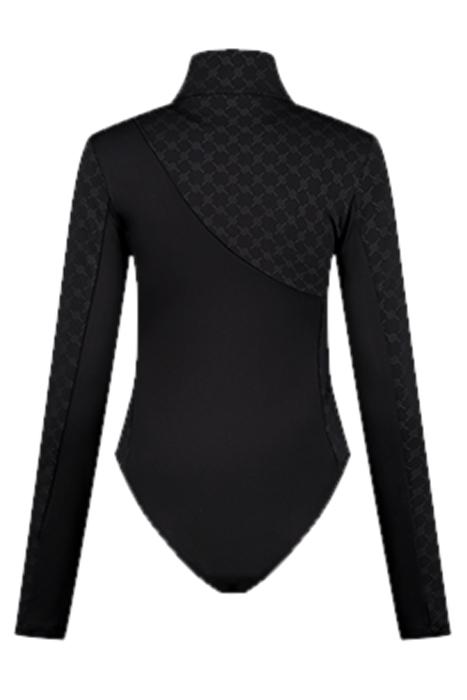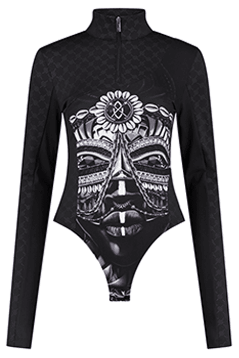 Turn heads in this figure hugging, turtleneck bodysuit cut from soft, stretchy jersey for a bodycon aesthetic. Distinctive fabric construction combines fabric panels with a monogram and African inspired design.
