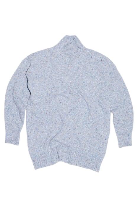 Thick Knit Alpaca Wool Sweater In Blue Marl. Straight-Cut Design, Long Sleeve, High Neck, Above Hip Length.