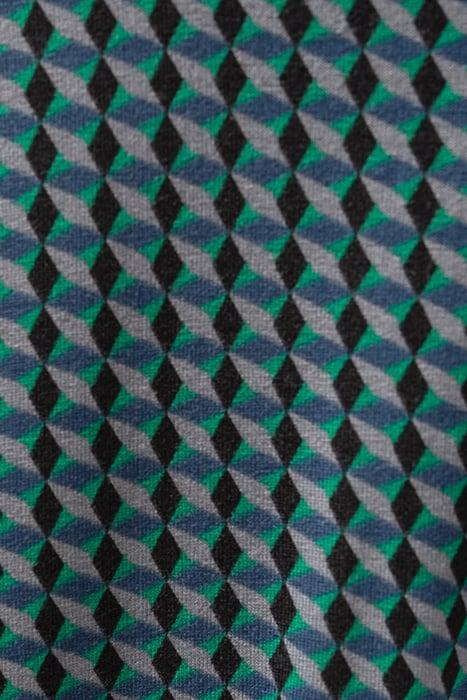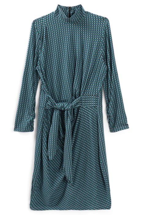 Give It To The High Collar And Draped Effect Of This Dress With Tie Belt, Worn Snugly Against The Body. The Geometric Optical Print Adds A Retro Touch.