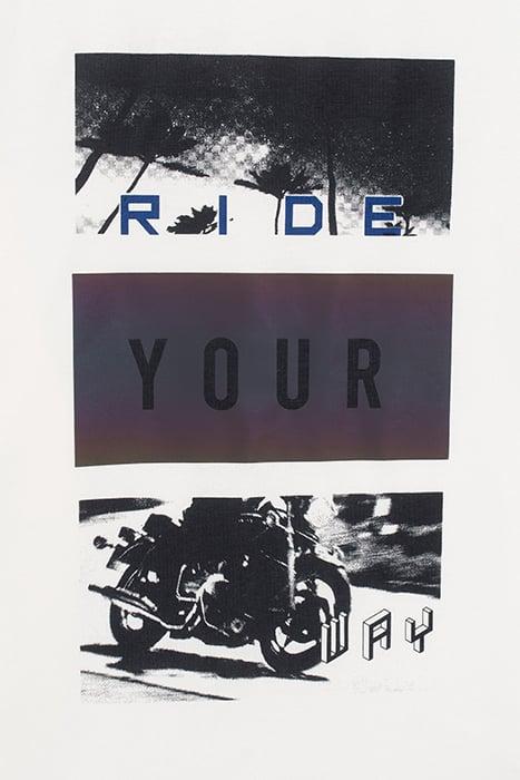 Ride. Your. Way. Three words. Three images. Three vibes. This is a white T-shirt that celebrates summer, with a palm tree backdrop, with gradually faded colours and a stylish motorbike.
