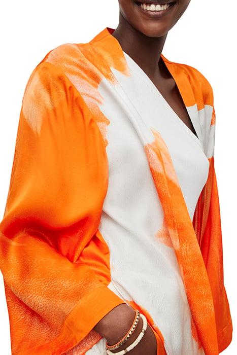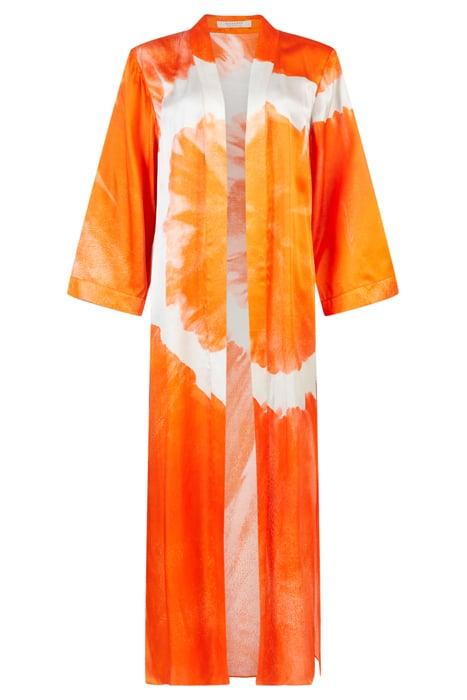 Carine Mariana Kimon Orange Tiedye. Perfect for layering or standing out on its own, this Orange Robe is the definition of understated luxury. A key addition to any wardrobe, this piece is designed for those who seek effortless style.