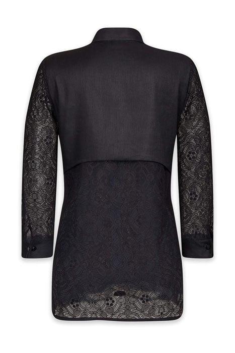 CHARME is a long black linen shirt with ¾ sleeves in fine lace ending in single linen cuffs with cufflinks. The contrast of raw linen and intricate lace in the back and on the sleeves is very feminine and exude sophistication.