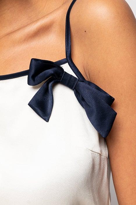 This couture top is fully lined and has a contrasting trim. Other interesting details include the rounded buttons, the concealed zip at the side, and the removable bow detail. Wear with trousers or the matching skirt to create a faux dress or jumpsuit.