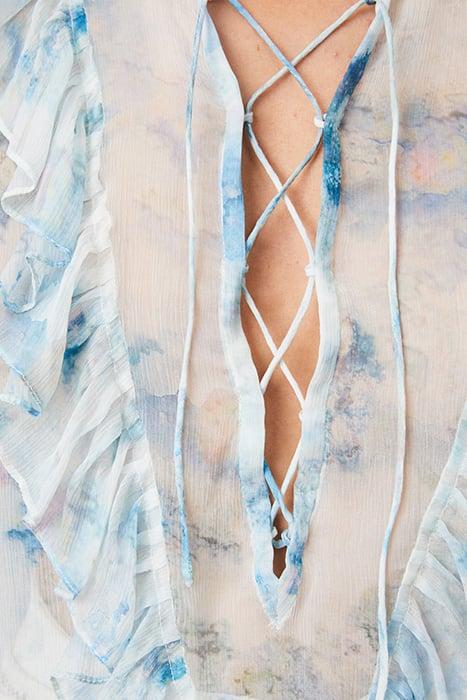 Step into modern luxury with the Cruis Blouse In Blue, a seamless fusion of edgy Parisian aesthetics and refined details. Perfect for creating a bold yet sophisticated silhouette.