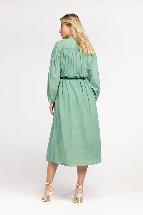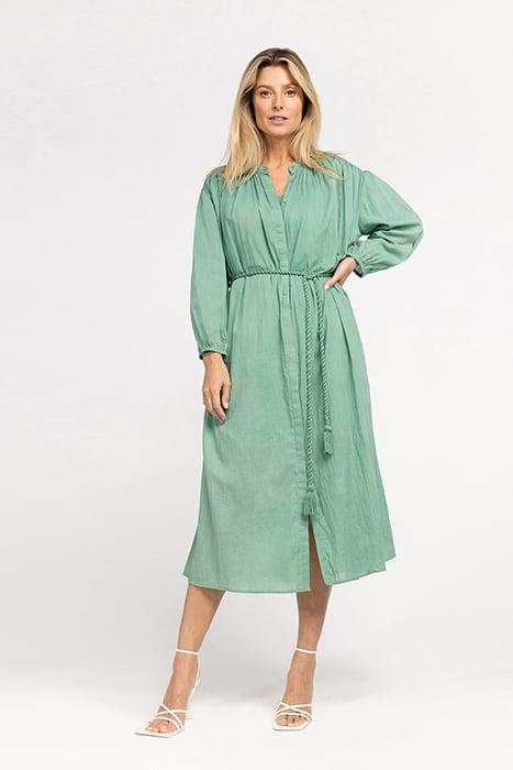 The Supple Dress Is Fitted With A Rope In The Same Color As The Dress, Is Buttoned All The Way Through And Has A Stand-Up High Closed Collar. Due To The Fact That The Dress Is Made Of 100% Cotton, It Is Particularly Airy And Comfortable. The Length Is Below The Knee.