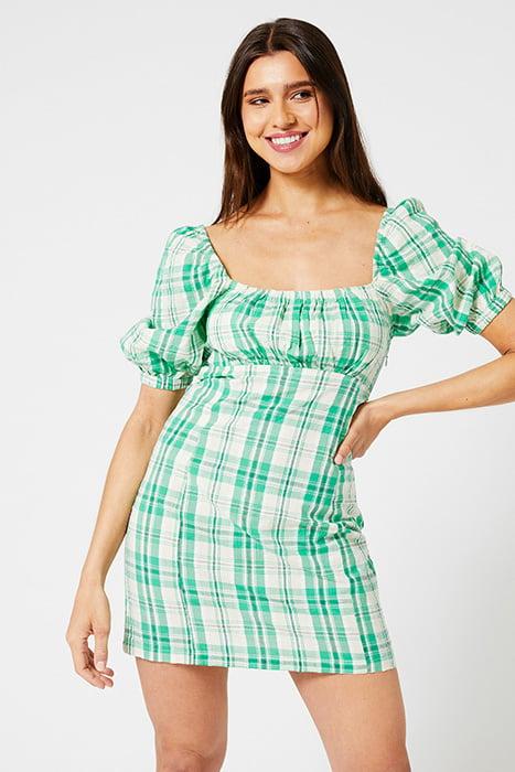America Today Dress For Women. This Summery Dora Dress Has An All-Over Plaid Print And A Cheerful Color. The Dress Has Puff Sleeves And Is Made Of A Nice Airy Cotton Fabric That Falls Around The Body. This Dress Is Perfect For The Warm Summer Days.