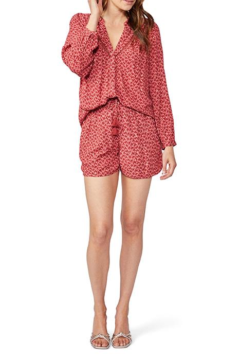This three-quarter sleeve blouse features a bright papaya hue with an ikat print and a metallic gold clip dot. Design details include angled yokes with shirring, ladder stitch trim, a button front, a feminine v-neckline, and a mini ruffle along the neck. Pair this beauty with your favorite flares or wide legs.