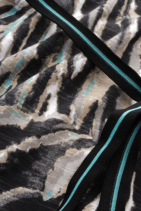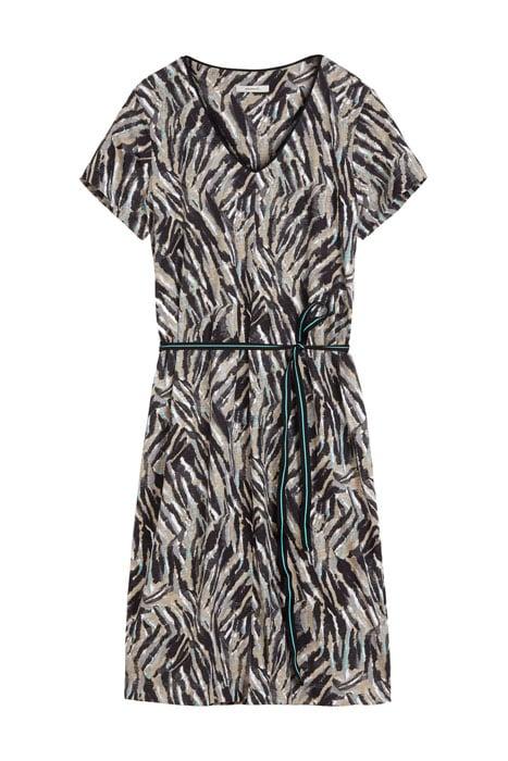 Korte tricot jurk met abstracte print in meerdere tonen. De afgeronde V-hals is afgewerkt met een contrasterende bies. De jurk heeft korte mouwen en kan getaiilleerd gedragen worden met de bijpassende ceintuur.