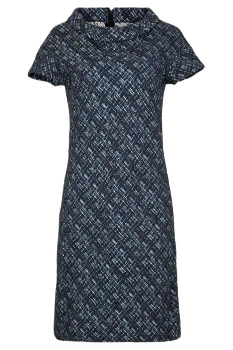Dress in luxurious tweed quality in different blue nuances. The model is made with a concealed zipper at the center back. The length of the dress is up to the knee. Expertly made in our own studio.
