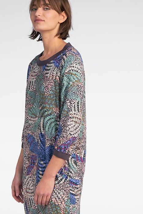 Voeg wat kleur toe aan je garderobe met deze multi coloured statement print. De jurk is gemaakt van een soepele kwaliteit en heeft een effen fijne rib boord op de mouwen en de halslijn. Draag de jurk solo of als het koud is met een lekker warm vest.