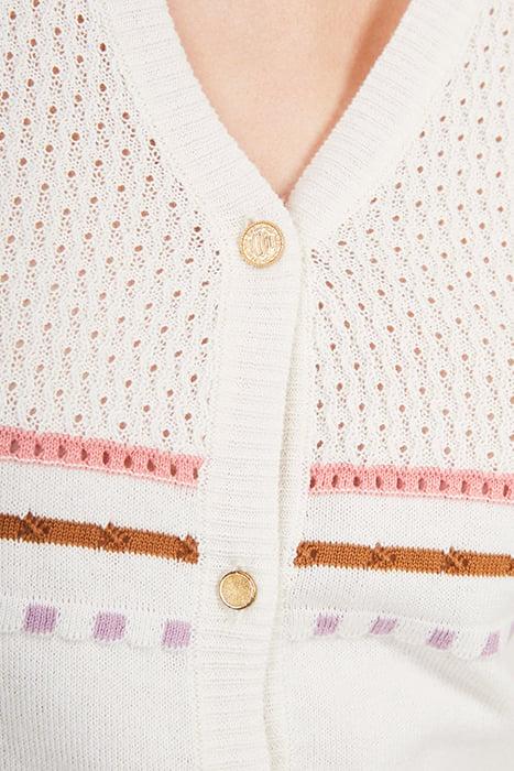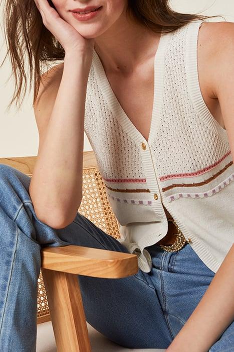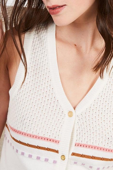 ECRU STRIPED FINE KNIT SLEEVELESS CARDIGAN