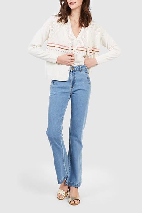 Women'S Ecru Cardigan V-Neck, Sleeveless Decorative Fine Knit, With Openwork Stitching And Placed Stripes 1X1 Ribbing On Neck, Shoulders And Hem