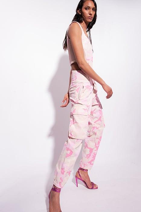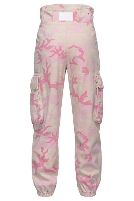Slightly Oversized Cotton Bull Cargo Trousers With Pink-Coloured Camouflage Print All Over. High Waist With Belt Loops, Side Pockets With Pointed Flap, And Large Gusseted Side Pockets. Cinching Elastic Band At The Bottom Of The Legs. Metal Zip And Tack-Button Fastening. - Model Is 178Cm Tall And Wears A Size 40.