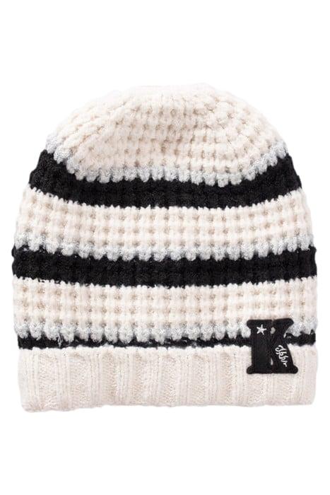 Girls’ Ecru Beanie Decorative Knit, Striped Motif With Lurex K Badge On Front, On Ribbed Turn-Up Tone-On-Tone Synthetic Lining Ikks #Actforbetter: Fabric Contains 97% Recycled Polyester