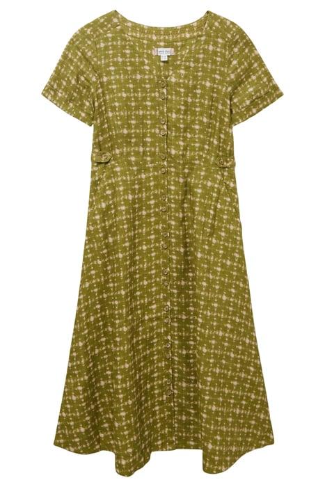 Plain Linen Dress, Short Sleeve, Front Pockets, Waist Tab And Button Detil, Button Down Centre Front, V Neck