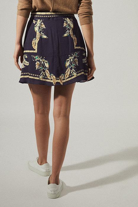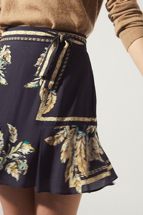 Sitting high on the waistline, the A-line silhouette is brought to life through a bold print and ruffle hemline.