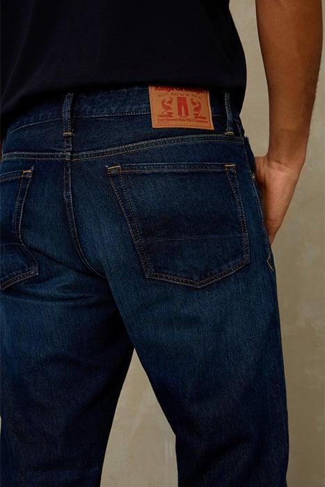 Long Rise, Tapered Leg, Non-Stretch.