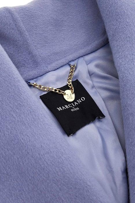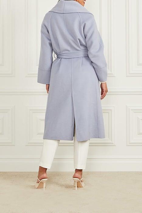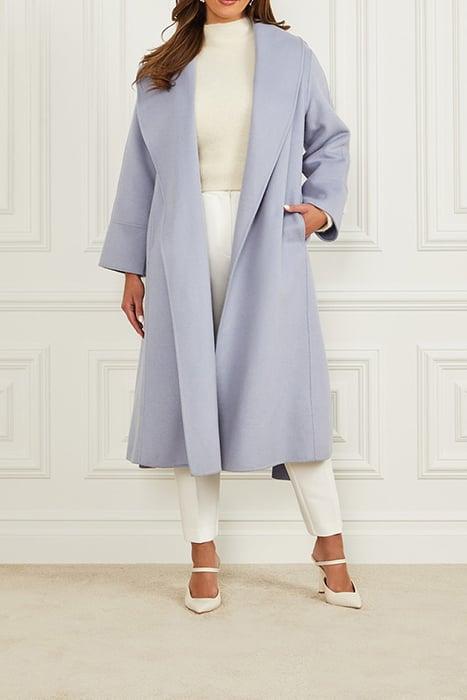 Elevate your wardrobe with the Keera Coat Dust Light Wrap Blue, a statement piece designed for modern elegance.
