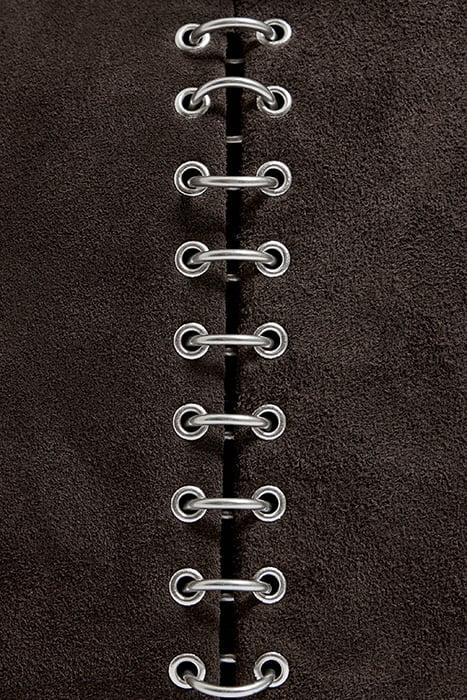 Suede Leather Shopper Bag In Charcoal. Large Model With Magnetic Fastener And Double Handle. Exterior Customized With Metal Logo And 116 Piercings.