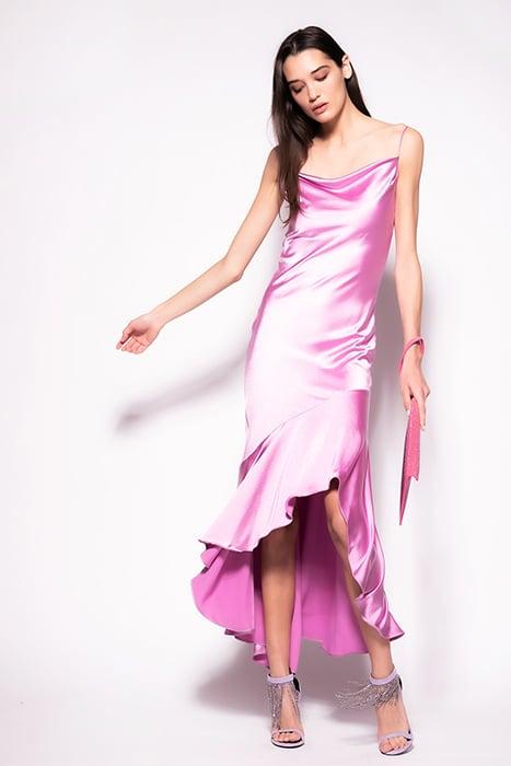 Long, Sleeveless Dress In Glossy Hammered Satin. Flowing Silhouette, Thin Shoulder Straps And Straight Neckline With Draped Effect. Asymmetric Skirt With Ruffles. Concealed Central Zip Fastening On The Back. - Model Is 177Cm Tall And Wears A Size 40.
