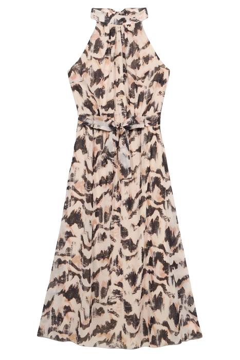 Flowing Georgette Pattern Long Dress, Halter Neck With Ribbon To Be Tied In A Bow At The Back, Sash At The Waist And Tone-On-Tone Lining