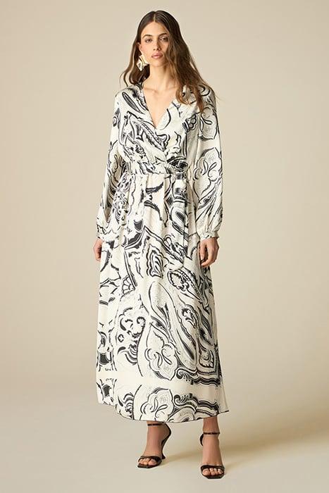 Long Flowing Satin Dress With Foulard Pattern, Top Crossover Part Creating A V-Neckline, Elasticated Stitching At The Waist And Sash To Tie In A Bow