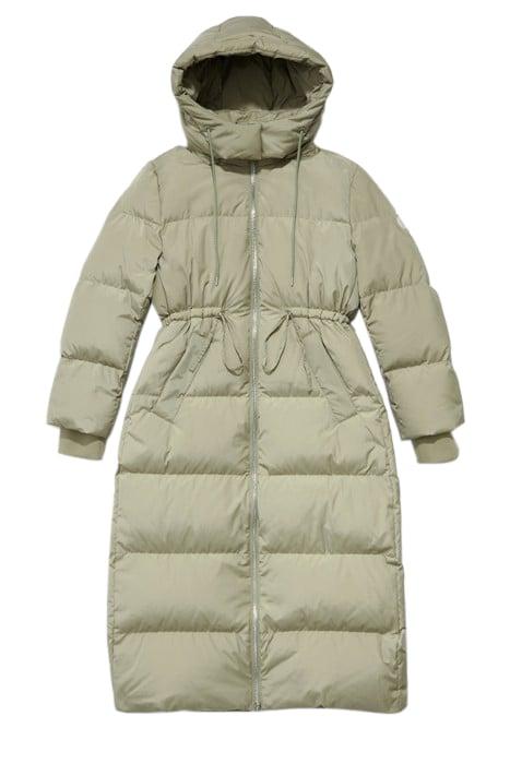 Long Down And Feather Puffer In Powder Green. Straight Cut, High Neck With Detachable Hood And Front Zip Fastener. Drawstring Waist, Side Pockets And Chimo Logo On The Sleeve. This Model Contains 100% Responsibly Produced Feather And Down.