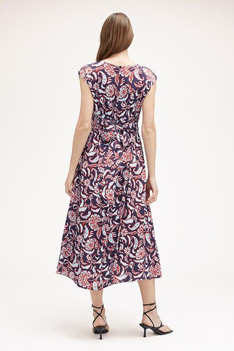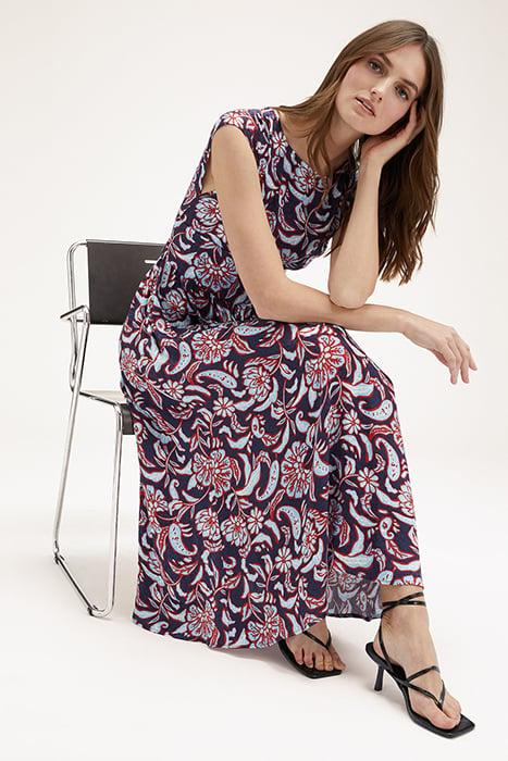 Long Scarf Patterned Viscose Satin Dress, Sleeveless Model With Boat Neck And Rear Opening, Zip Fastener At The Centre Back, Bandeau At The Waist To Be Tied, Flared Skirt