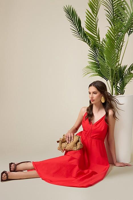 Long Fresh Cotton Blend Poplin Circle Skirt, V-Neck, Lined At The Top, Thin Adjustable Shoulder Straps, See-Through Openwork Detail.