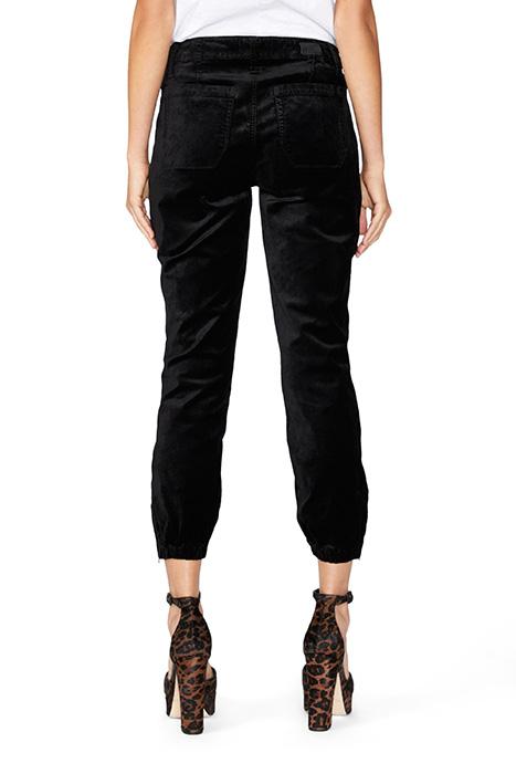 This mid-rise jogger feels feminine and elevated in black velvet. This style was inspired by the utility trend on the runway and PAIGE put a unique twist on it with a streamlined silhouette, double button closure and zipper detail at the ankle. Our ultra-soft, lustrous velvet is fabricated with plenty of stretch for a comfortable and flattering fit. We recommend styling this velvet jogger with a simple tee and sneakers for the farmers market and with a silk blouse and ankle boots for a night out.