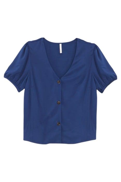 Women’S Navy Top V-Neck, Short Balloon Sleeves Buttons On Front To Fasten