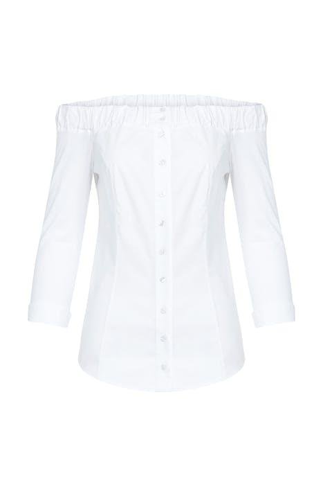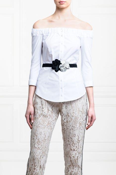 The PEARSON is a Broadcloth cotton shirt with 3/4 length sleeves in stretch jersey cotton. The elastic at the neck allows this style to be worn on or off the shoulders. The sleeves are finished with a single cuff in Pima cotton that allows for decorative cufflinks.
