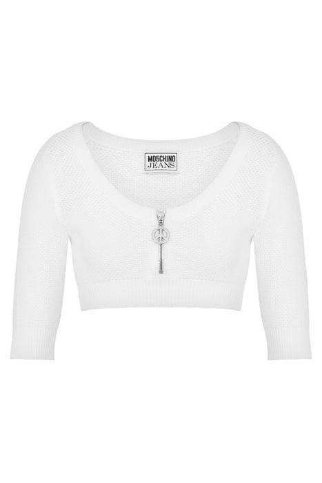 Crop Top In Stretch Cotton Pique With Zip On The Front And Metal Zip Puller In The Shape Of A Peace Symbol.