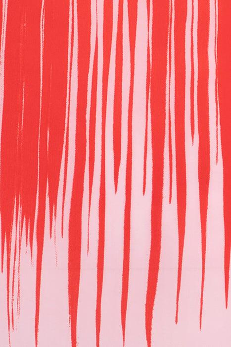 Relaxed 3/4 sleeve crewneck blouse. Side slits with straight high low hem. CB neck slit with button and loop. Made in pr inted silk viscose.