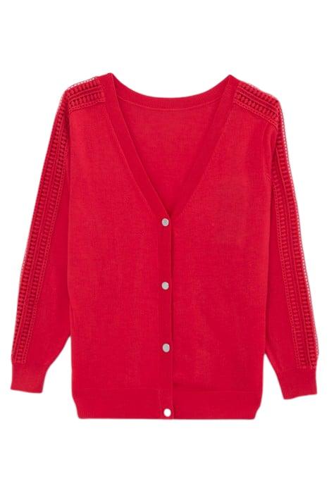 RED KNIT CARDIGAN WITH GUIPURE LACE SLEEVES