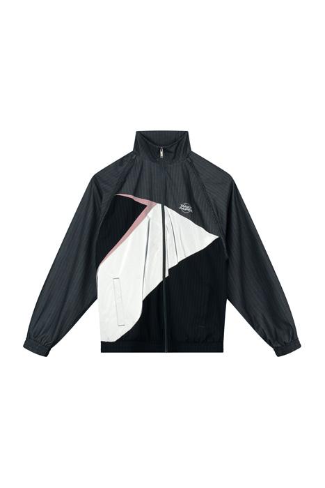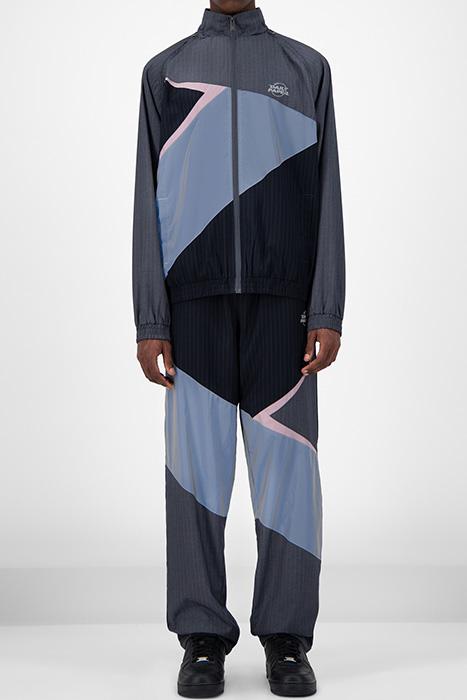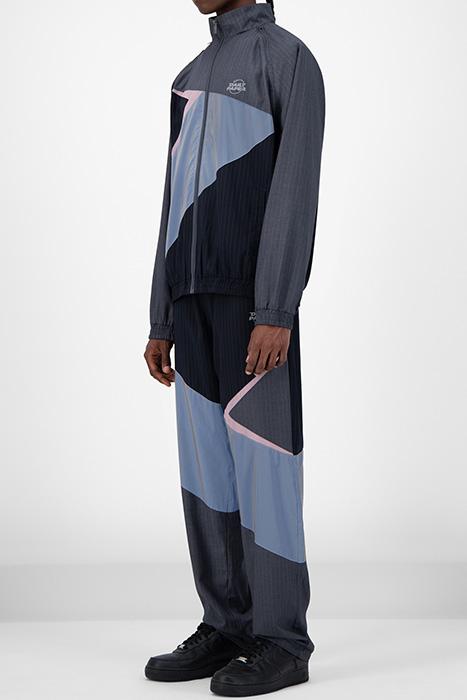 Expertly crafted like a suit jacket but with the youthful edge of a piece of sportswear, this deconstructed and asymmetric jacket is crafted from two types of pinstripe suiting fabric alongside 3M reflective panels, with detachable sleeves. Blending the suave aesthetic of a blazer with the wearability of the tracktop, they feature a mesh lining for added warmth alongside a funnel neck to keep the elements out.
