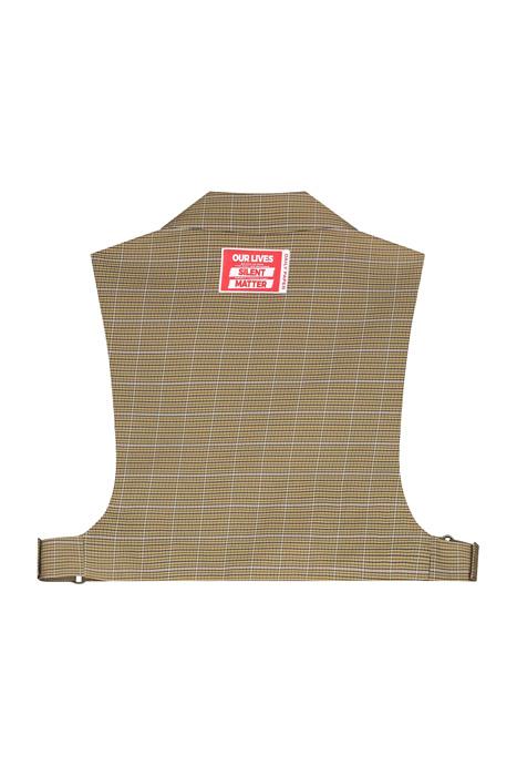 A tailored take on the tactical bullet-proof vest, this spin on a utility vest features the lapels of piece of outerwear and is constructed from a heritage check knit fabric. The vest is fastened at the side using two velcro straps. A small woven label beneath the collar adds to the fresh-out-of-the-tailors aesthetic.