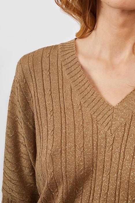 Women’S Sand Sweater V-Neck, Long Sleeves, Dropped Shoulders Lurex Cable Knit, Side Slit Detail 1X1 Ribbing On Neck, Cuffs And Hem