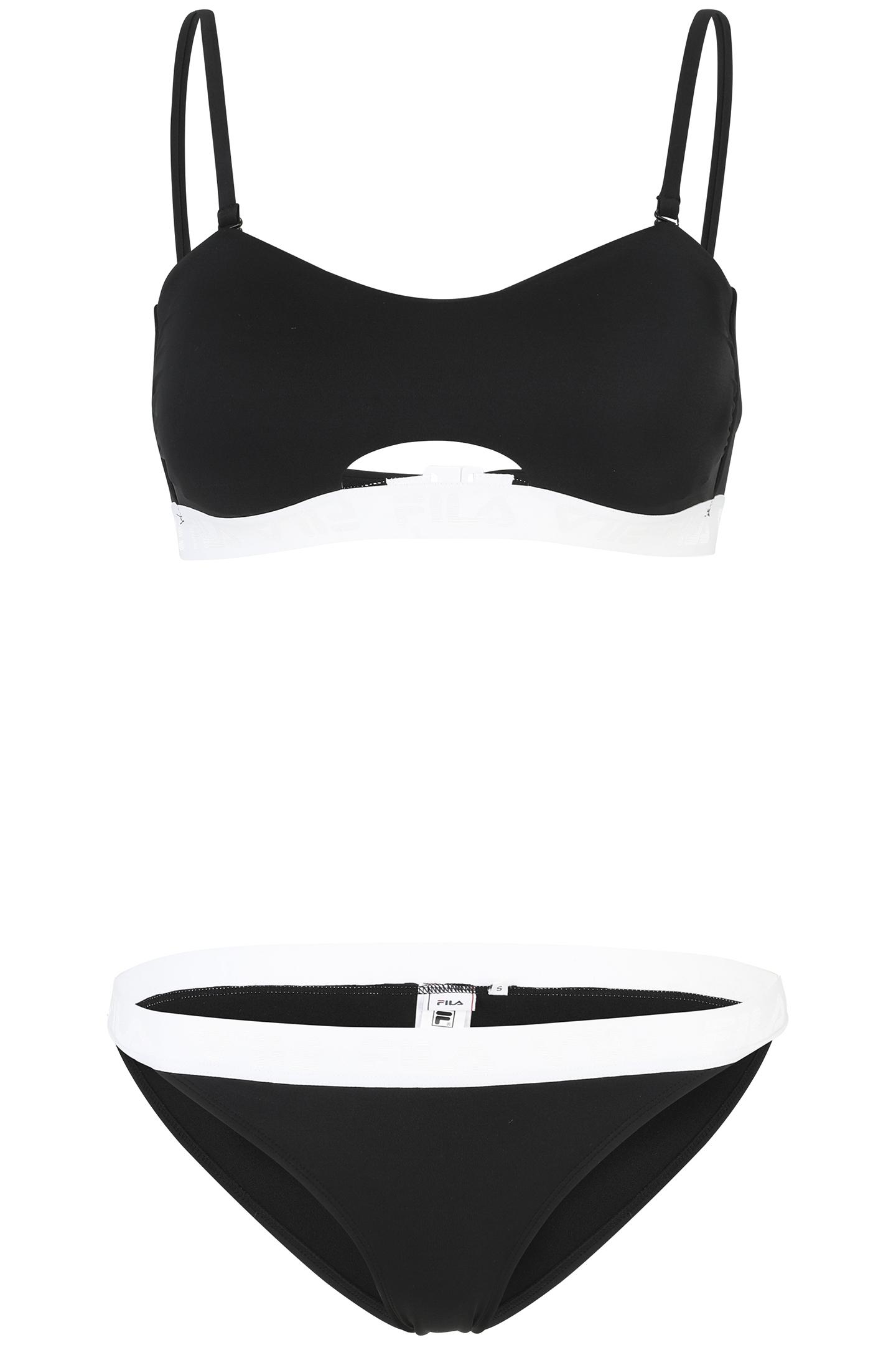 Bandeau Bikini In A Single Jersey Lycra Quality. Bandeau Shaped Bra Top With Adjustable And Removable Straps. Plastic Buckle For Closure At Back And Detailed With An Elastic Tape That Is Branded With The Fila Linear Logo. Combined With A Pair Of Regular Bottoms With The Same Branded Elastic Tape And Waistline.