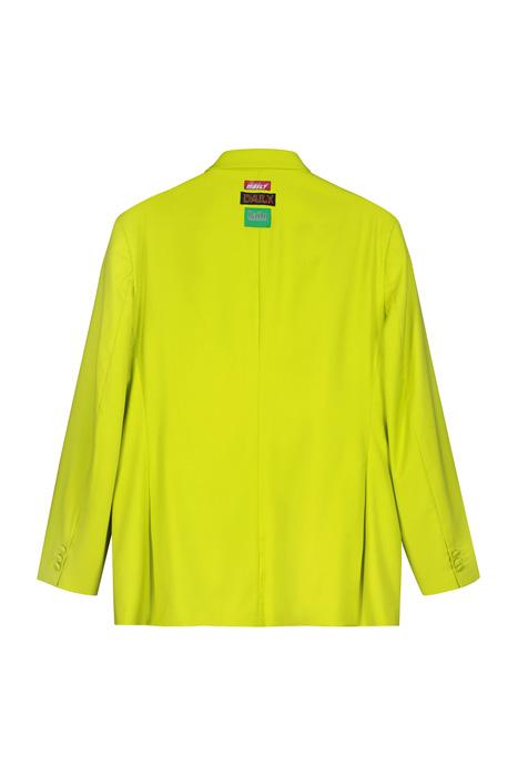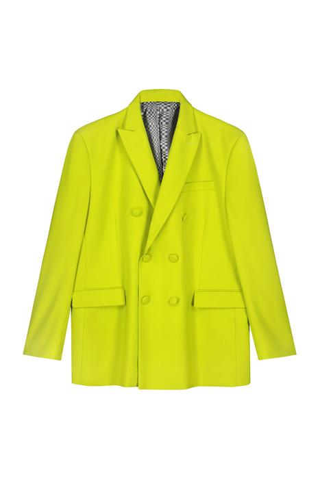 A modern piece of tailoring in every way, this double-breasted blazer is cut from a striking neon green fabric with an oversized fit. This piece of suiting pays attention to detail with a blurred zebra lining, fabric coated buttons and three exposed woven labels on the upper back. The wide lapels and chest pocket are perfect for pin badges or pocket squares. Pair with the Geen Hiro Pants for the ultimate slouchy suit look.