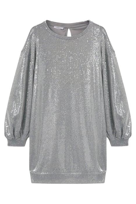 Short Shiny Effect Plush Dress In Lurex Blend Yarn With Tiny Sequins, Round Neckline, Rear Keyhole Opening, Long Puff Sleeves
