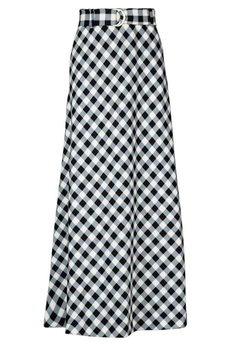 Long checked skirt with elastic band at the waist and matching belt with silver D-ring. The skirt is cut diagonally and therefore falls elegantly and relaxed around the body. The skirt is very comfortable to wear due to the elastane in the fabric. The model is 1.75m and wears size 36.