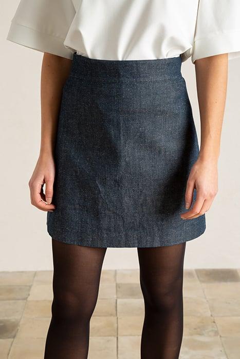 Short 5-pocket skirt in luxurious denim quality in dark mixed wash. The model has a concealed zipper at the back and fits nicely at the waist.
