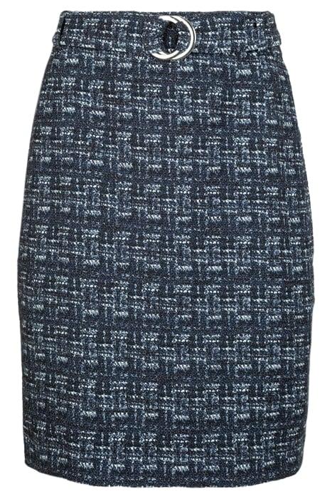 Short pencil skirt model in luxurious tweed quality in different blue nuances. The model has belt loops and a matching buckle in the waistband. The length of the skirt is just above the knee. Expertly made in our own studio.