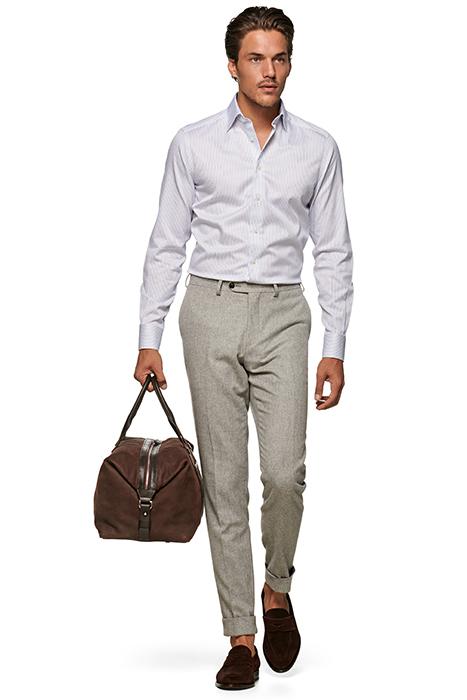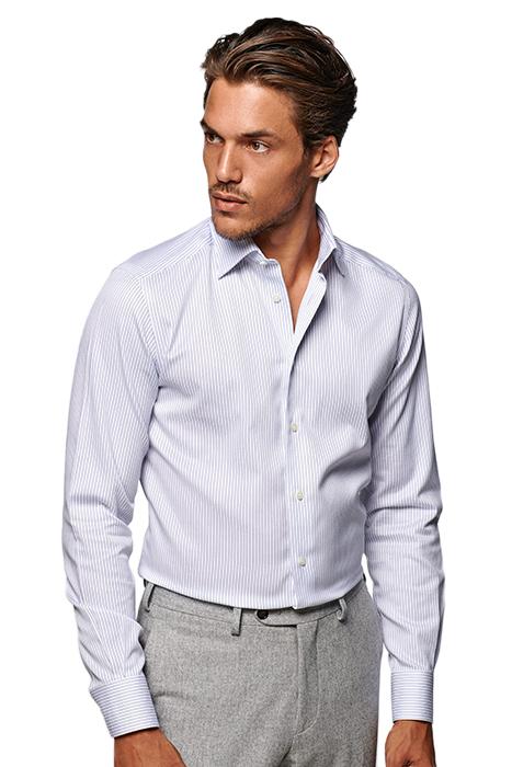 • Tailored to our formal slim fit, this handsome dress shirt features a classic pointed collar and single cuff. Cut soft, wrinkle-resistant Traveller cotton, it boasts a tasteful navy pinstripe pattern.