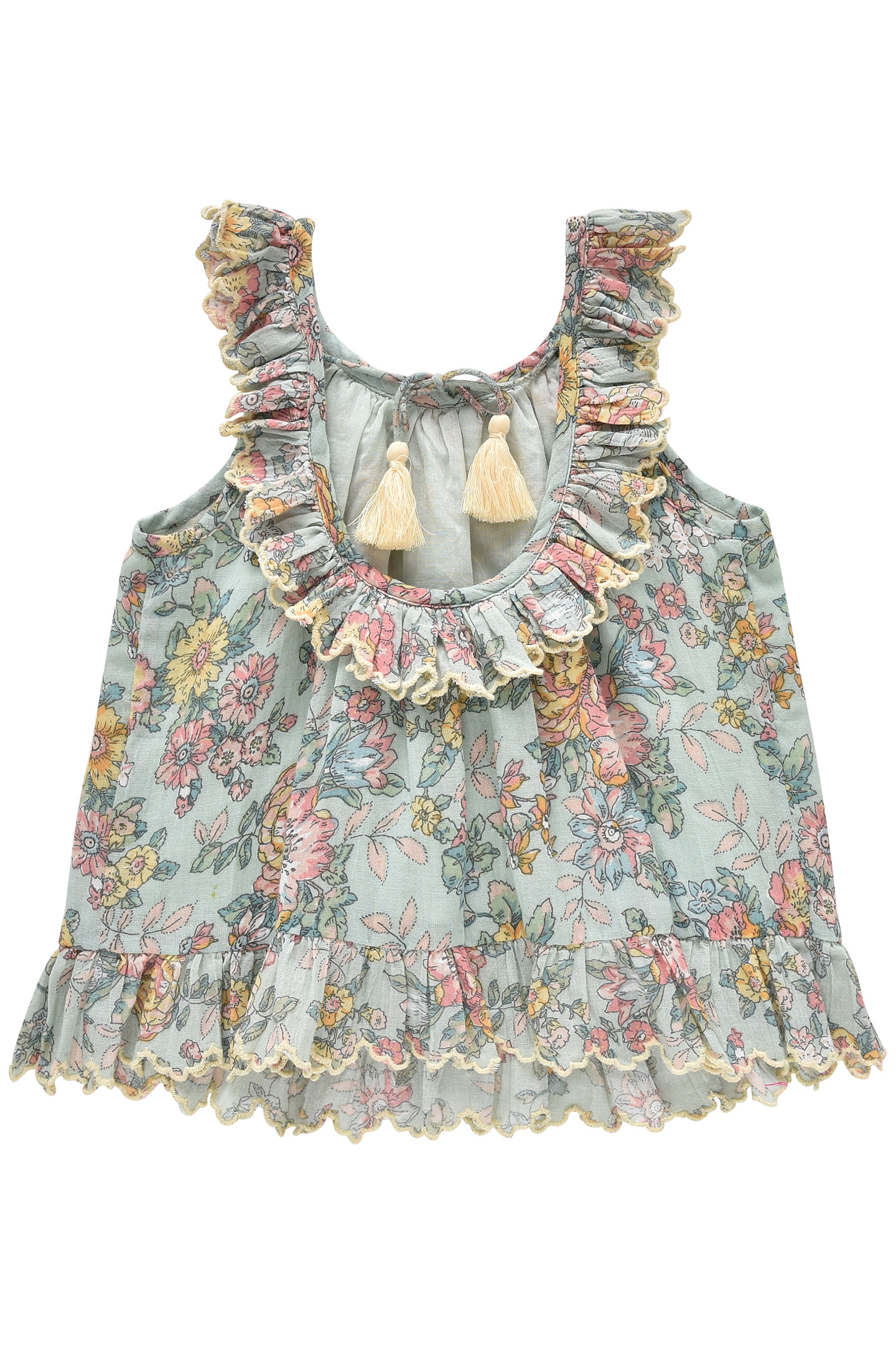 - Round Neck With Scalloped And Embroidered Ruffles.